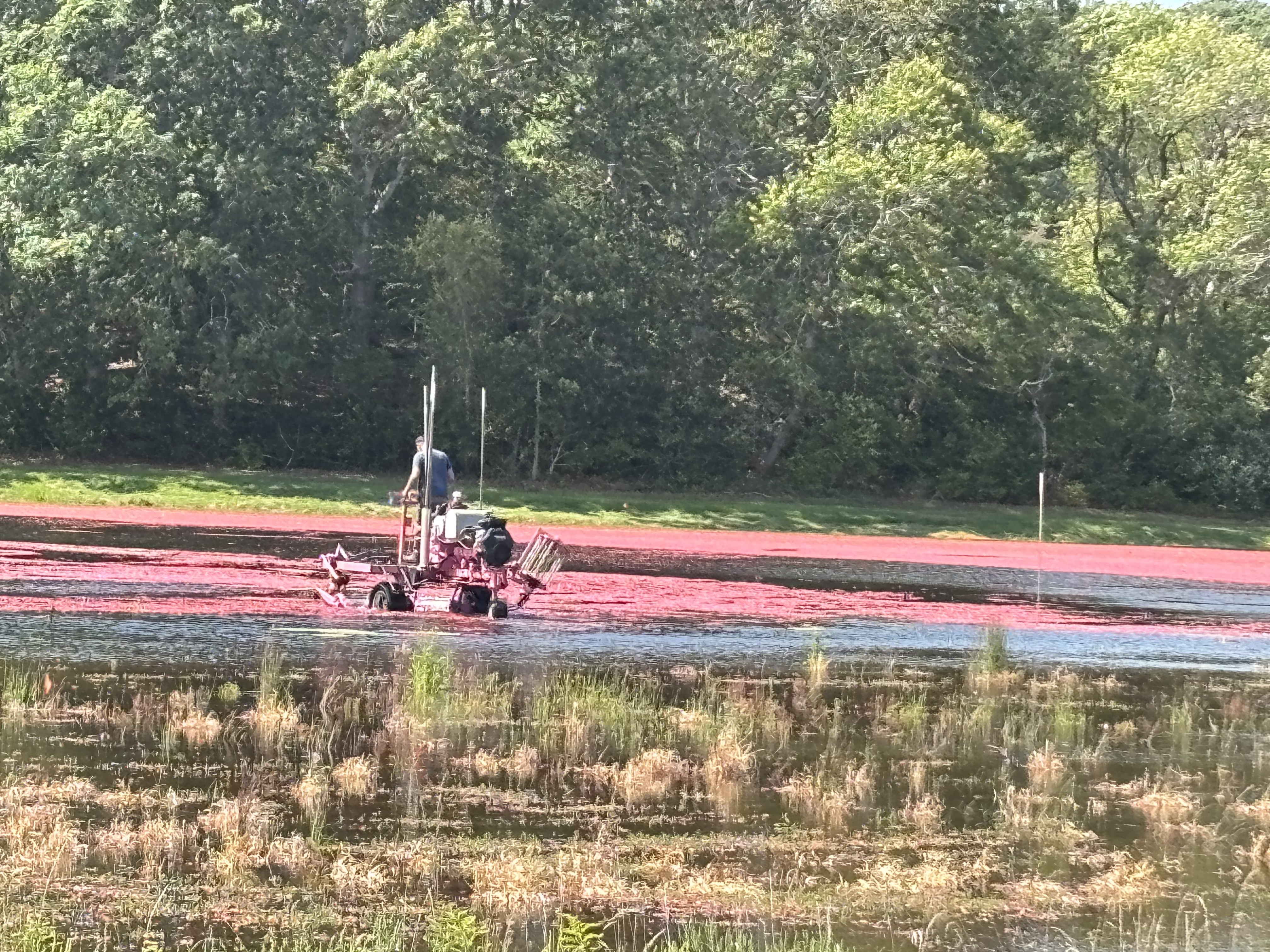 The harvest begins by first flooding the entire bog. Next the beater machine comes in to shake the bushes into releasing the berries.