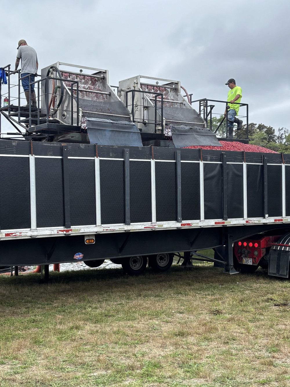 The six poles sticking up between the two men is the location of a vacuum that attaches to a wide tube and empties the cranberries into an 18-wheeler trailer. This bog fills two trailers.