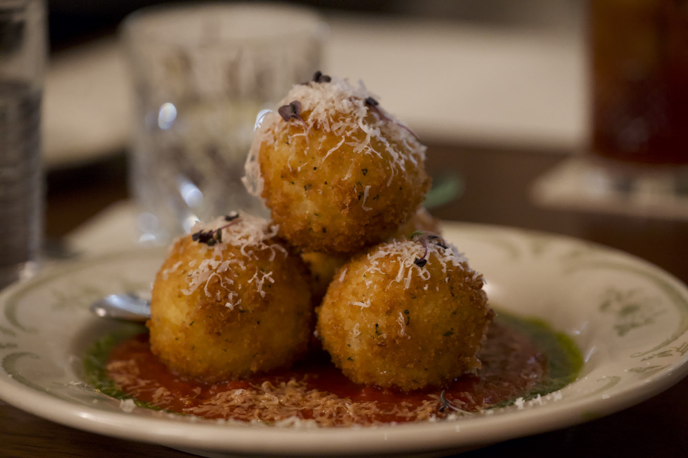 Del giorno is Italian for “of the day,” you’ll find several appetizers in this section of the menu. The arancini are loaded with saffron risotto and house-pulled mozzarella.